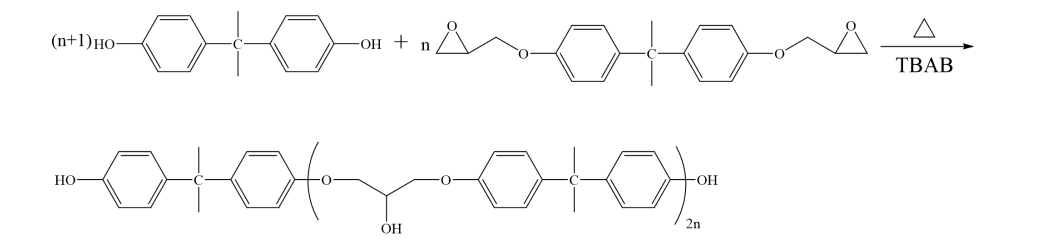 環(huán)氧型雙酚(PHOH)由雙酚 A 型環(huán)氧樹脂 E376(環(huán)氧當量為 185-190)和雙酚 A 在四 丁基溴化銨為催化劑的條件下所制備,反應(yīng)方程式如圖 1 所示。由尺寸排阻色譜法(SEC) 測得分子量 Mn=3641,計算得到重復(fù)單元 n=10。
