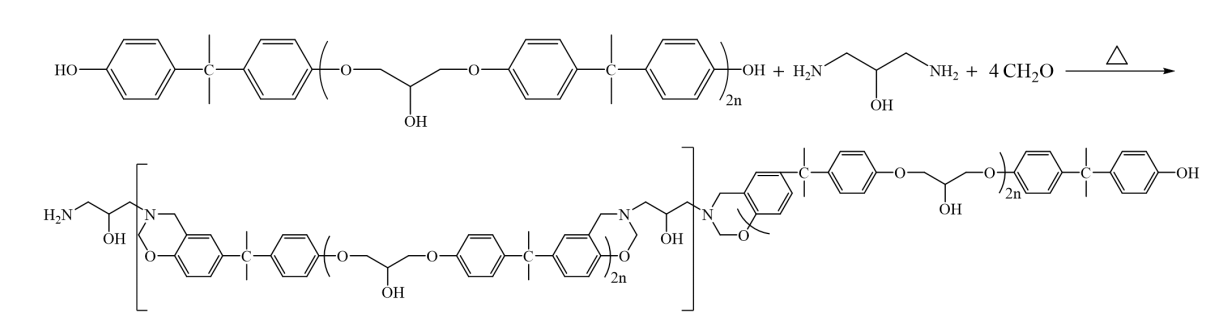 通過本課題組已報道的制備方法[5-7],將 PHOH 與 1,3-二氨基-2-丙醇、多聚甲醛通過溶 液法制備出含羥基的主鏈型苯并噁嗪預(yù)聚體,并進行仔細純化即得雙酚環(huán)氧-1,3-二氨基-2- 丙醇型苯并噁嗪(DAP-Bz),反應(yīng)式如圖 2 所示。由 SEC 測得分子量 Mn=3942。