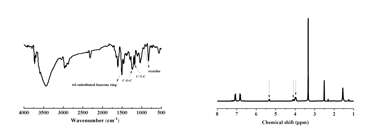 如 DAP-Bz 的 FTIR 譜圖所示,1242 cm-1和 1181 cm-1分別是噁嗪環(huán)上 C-O-C 和 C-N-C 的非 對稱伸展吸收峰,1508 cm-1 為三取代苯環(huán)的特征吸收峰,944 cm-1 對應(yīng)于噁嗪環(huán)的特征吸收 峰。尤其,在 3444 cm-1處有非常強的羥基特征吸收峰。以上結(jié)果說明含羥基的主鏈型苯并 噁嗪預(yù)聚體的生成。1H NMR 譜圖進一步證明主鏈型噁嗪環(huán)的生成,δ=5.32 ppm 和δ=3.98 ppm 分別對應(yīng)于苯并噁嗪環(huán)上 O-CH2-N 和 Ar-CH2-N 結(jié)構(gòu)中 H 的化學位移。而δ=4.33 ppm 對應(yīng)于 醇羥基[-O-CH2-CH(OH)-CH2-]中 H 的化學位移。