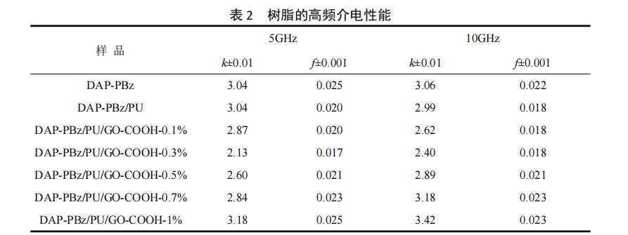 DAP-PBz 及其復(fù)合樹脂的介電常數(shù)值如表 2 所示。聚苯并噁嗪和聚(苯并噁嗪-氨酯)均 具有相對較高的 k 值(≈3)。通過引入無機粒子 GO-COOH 到樹脂基體中,雜化納米復(fù)合樹 脂的 k 值隨著 GO-COOH 的加入量呈現(xiàn)先下降后增加的趨勢。當 GO-COOH 加入量為 0.3%時 雜化納米復(fù)合樹脂的 k 值達到最小值, k 值為 2.13(5 GHz)和 2.40(10 GHz)。這主要是因 為 GO-COOH 是通過共價鍵引入到樹脂基體中,由于碳原子從 sp2雜化變?yōu)?sp3雜化并且層狀 結(jié)構(gòu)的無機粒子會引入空氣和孔隙,能夠降低整個樹脂基體的極性并影響結(jié)構(gòu)重排,從而有 效降低復(fù)合樹脂的介電常數(shù)。然而,當 GO-COOH 加入量超過 0.3%時,雜化納米復(fù)合樹脂的 k 值逐漸變大。主要是由于 GO-COOH 加入量過多時會阻礙苯并噁嗪分子之間的聚合交聯(lián), 而且納米效應(yīng)不明顯還會產(chǎn)生一定程度的團聚,從而使得 k 值變大。值得注意的是,當 GO-COOH 加入量為 0.3%時,雜化納米復(fù)合樹脂的 f 值最低 0.017(5 GHz)和 0.018(10 GHz)。 但所有樣品的 f 值在 5 GHz 和 10 GHz 條件下均處于 0.017-0.026 之間,說明尚需要進一步優(yōu) 化超高頻介電性能。