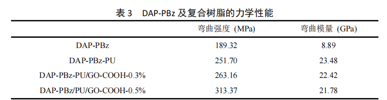 DAP-PBz 及其復(fù)合樹脂的彎曲強度和彎曲模量數(shù)值如表 3 所示。聚苯并噁嗪樹脂的彎曲 強度和彎曲模量分別為 189.32 MPa 和 8.89 GPa。與二異氰酸酯反應(yīng)后,由于互穿交聯(lián)結(jié)構(gòu) 的交聯(lián)密度變大,生成的聚(苯并噁嗪-氨酯)復(fù)合樹脂具有更高的彎曲強度(251.70 MPa) 和彎曲模量(23.48 GPa)。而當 GO-COOH 增強后,DAP-PBz/PU/GO-COOH 雜化納米復(fù)合樹脂 的彎曲強度和彎曲模量都得到了進一步的提高。這主要是由于苯并噁嗪預(yù)聚體、GO-COOH、 二異氰酸酯三者通過化學反應(yīng)構(gòu)建了新的三維網(wǎng)絡(luò)結(jié)構(gòu),使交聯(lián)密度進一步增大。同時,無 機粒子 GO-COOH 對力的作用起到一定的分散作用也使得 DAP-PBz/PU/GO-COOH 雜化納米復(fù) 合樹脂的力學性能變得更加優(yōu)異。